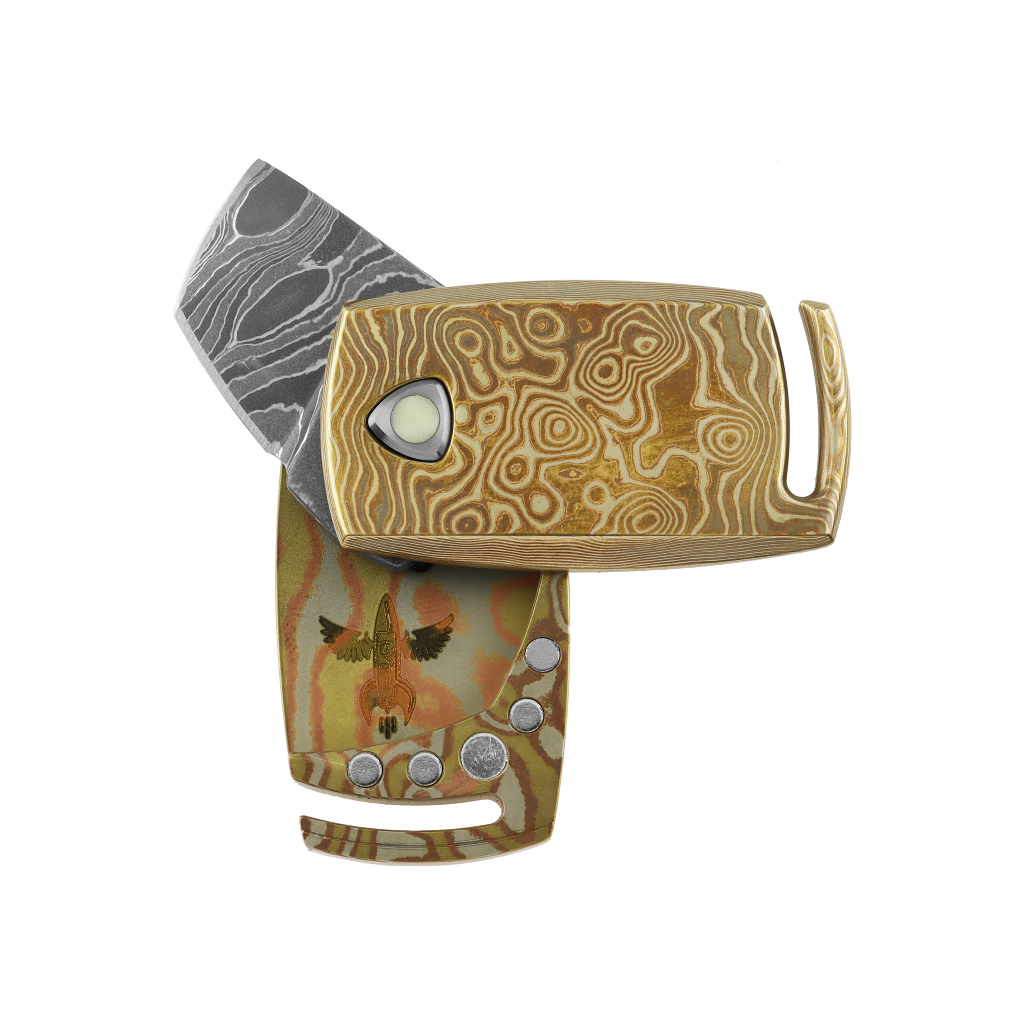 The IMP is a compact folding knife born from the collaboration between Audacious Concept and D Rocket Design, uniting Darriel Caston’s signature futuristic style with AuCon’s mechanical innovation. Despite its small size, this knife showcases engineering sophistication through its unique magnetic opening system and premium materials - including a MagnaCut modified tanto blade. Its distinctive silhouette, reminiscent of a modern car key, makes it both an exceptional EDC knife and a collectible piece of design.